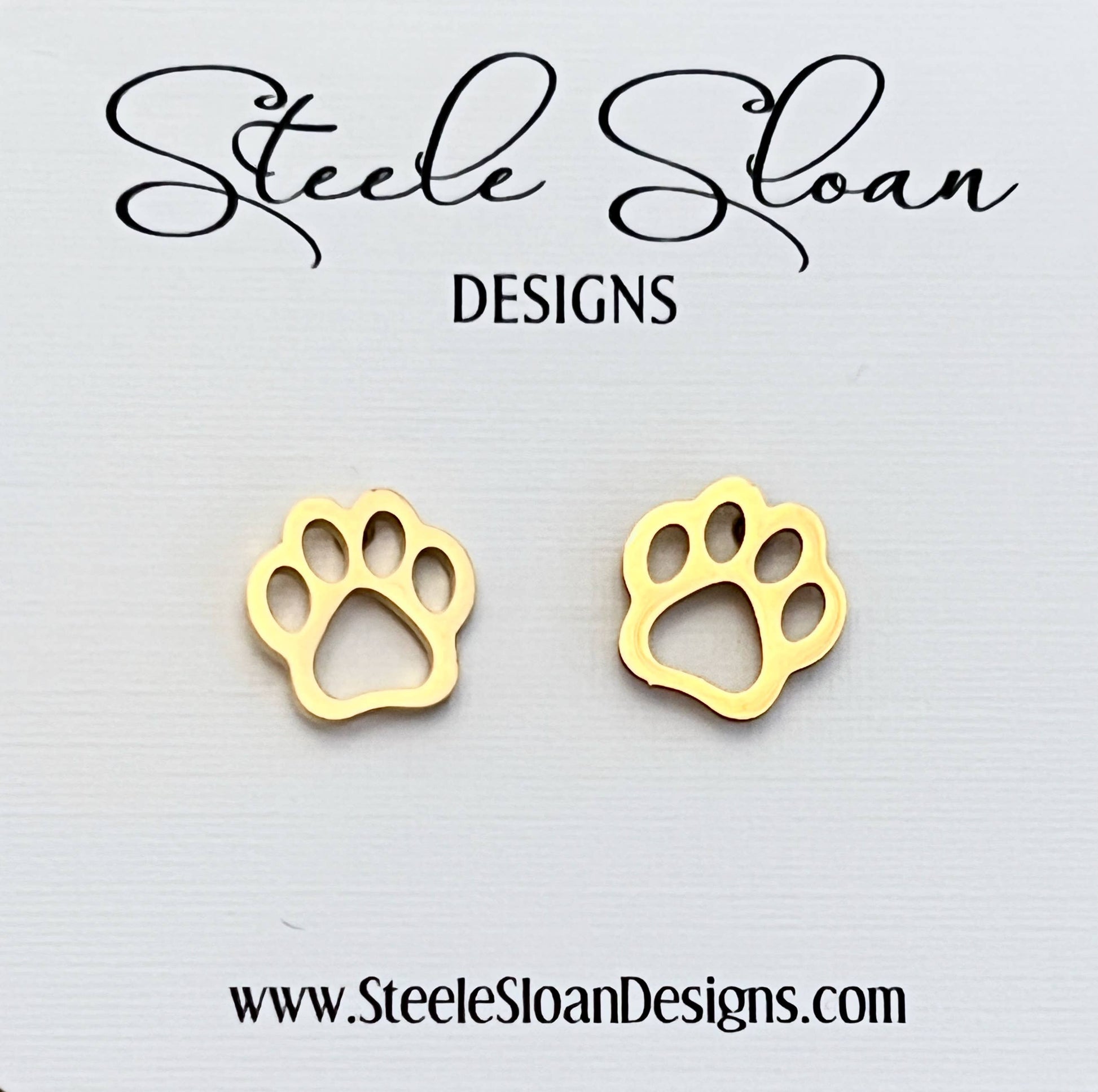 Adorable Paw Earrings in open style design - Gold Stud Earrings, Hypoallergenic Non-Tarnish Stainless Steel. Adorable Paw Gold Stud Earrings - These are great for Tiger Fans and Bears Fans- Super Cute Earrings - make the perfect gift! Earrings measure just a tad under 1/2 inch width/height
